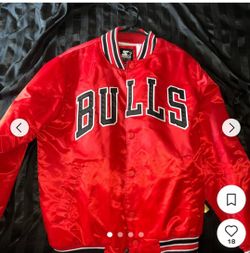 This is a red satin Chicago Bulls Starter jacket. $70Mableton, GA