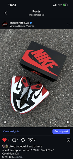 Jordan 1 “Satin Black Toe”$120Virginia Beach, VA