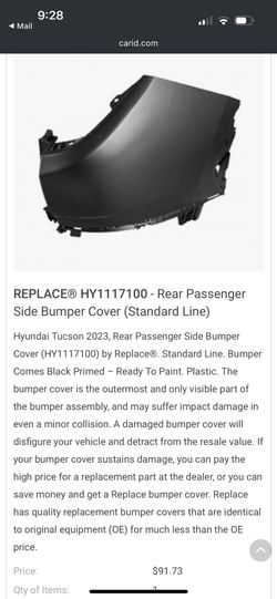 Hyundai Tucson 22-24 , Rear Passenger Side Bumper Cover (HY1117100) by Replace®. Standard Line. Bumper Comes Black Primed – Ready To Paint. Plastic.$50Riverside County, CA