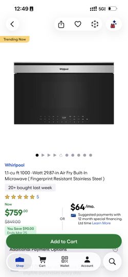 Whirlpool 1.1-cu ft 1000 -Watt 29.87-in Air Fry Built-In Microwave (Fingerprint Resistant Stainless Steel)$500Santa Ana, CA