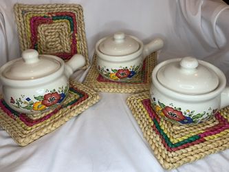 3 floral painted pots w/top and 4 pot coasters$20Sacramento, CA