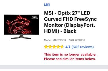 2 MSI - Optix 27" LED Curved FHD FreeSync Monitor (DisplayPort, HDMI) - Black$450Pembroke Pines, FL