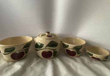 Vintage Watt Pottery Apple Bean Pot With Lid and Handles #76 And 3 bowls Small Medium Large $60Palm Shores, FL