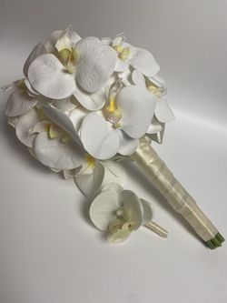 White Orchid Silk Flower Bouquet Ivory Ribbon Wrapped 13” With Boutonniere$50Palm Shores, FL