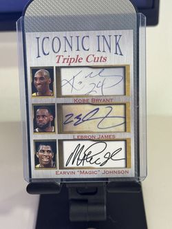 It's a NBA Trading card with three L.A Laker Legends Magic J, Kobe B and LeBron James with their autographs. This memorabilia piece features Facsimile$25Hialeah, FL