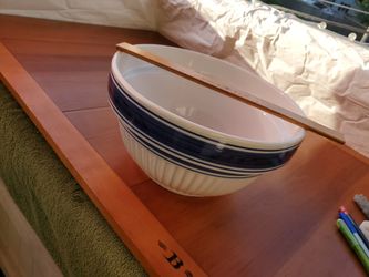 HUGE 10.5x6" VTG Ribbed Banded Nantucket Blue White Striped Ceramic Serving Dough Bowl$100Framingham, MA