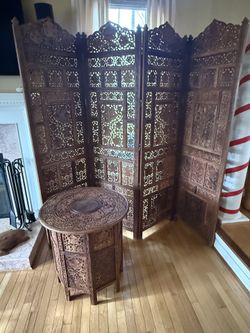 Vintage Room Divider, Four Panels, Teak, Wood Handcrafted With Matching Round Side Table. Both Collapsible Unique Can Fit Under A Bed.$1,500Virginia Beach, VA