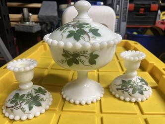 Consolidated, Hand Painted 8-1/2" Covered Candy Dish (Ivy on Milk Glass) Plus Candle Holders$25La Habra Heights, CA