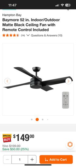 Hampton Bay Baymore 52 in. Indoor/Outdoor Matte Black Ceiling Fan with Remote Control Included$89San Diego, CA