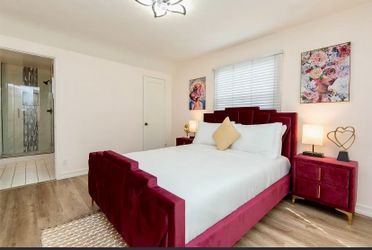 Queen frame mattress, nightstands, red white grey$300Los Angeles, CA