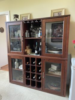 Elegant dark cherry 2-piece wine bar cabinet buffet with hutch, retail price $2000$400Bellevue, WA