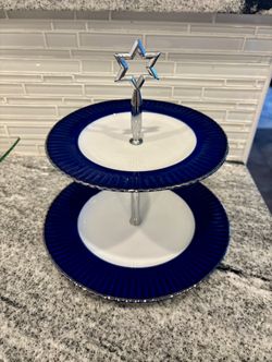 a two-tiered serving tray with white plates with a vibrant blue fluted rim and silver-tone edging$35Gilbert, AZ