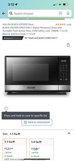 New — BLACK+DECKER EM031MB11 Digital Microwave Oven with Turntable Push-Button Door, Child Safety Lock, 1000W, 1.1cu.ft, Black & Stainless Steel, 1.1 $50Bloomingdale, IL