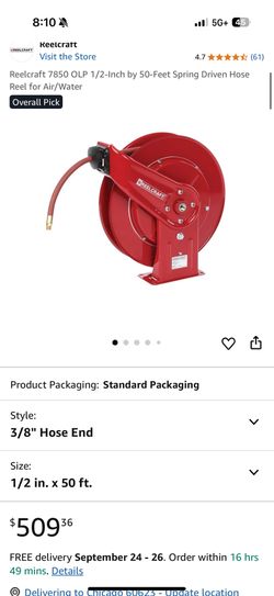 Reelcraft 7850 OLP 1/2-Inch by 50-Feet Spring Driven Hose Reel for Air/Water$220Chicago, IL