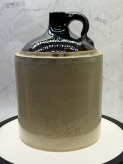 Antique/Vintage American stoneware jug, from the late 19th to early 20th century, featuring a classic two-tone design with a dark brown Albany slip gl$95Austin, TX