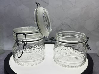 Set of (2) Vintage Floral Cove Glass Canister Jars, identified by their distinctive embossed floral and leaf designs and hinged wire bale lids. Clear $39Austin, TX
