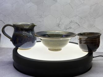 Lot of (3) Beautiful handmade stoneware pottery items featuring a pitcher, a serving bowl, and a smaller cup or bowl, all finished with multi-colored$29Austin, TX