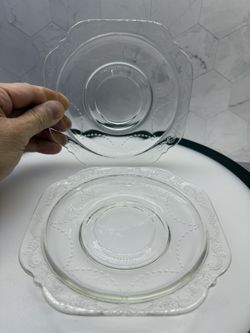 Set of (2) Vintage Federal Glass Madrid pattern clear depression glass saucers from the 1930s featuring intricate embossed scrollwork and scalloped ed$15Austin, TX