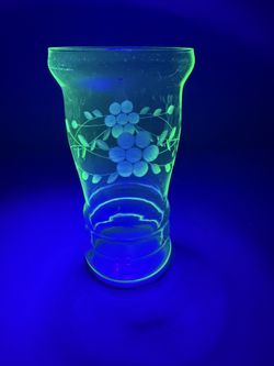 As-is. Set of (2) Vintage Dunbar Green Uranium Glasses Etched flower Design Glow Vaseline. One glass has a small chip on top lip.$25Austin, TX