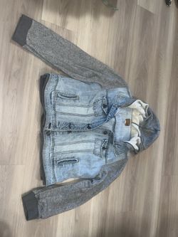 Women’s American Eagle Outfitters Hooded Denim Jacket with gray jersey knit sleeves $25Watsonville, CA