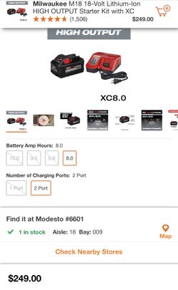 Milwaukee M18 18-Volt Lithium-Ion HIGH OUTPUT Starter Kit with XC 8.0Ah Battery and Rapid Charger$150Modesto, CA