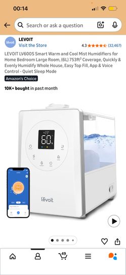 LEVOIT LV600S Smart Warm and Cool Mist Humidifiers for Home Bedroom Large Room, (6L) 753ft² Coverage, Quickly & Evenly Humidify Whole House, Easy Top $80Mission Viejo, CA