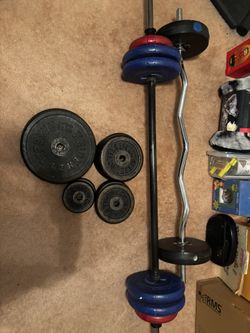 Weider Barbell Weights 25 Pound 10 Pound 5 Pound And 4 Pound Plus Plastic Weights, A Curling Bar And A Straight Bar$425Oakbrook Terrace, IL
