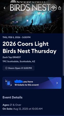 ZACH TOP BIRDS NEST TONIGHT! GA & VIP$200Guadalupe, AZ