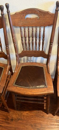 Vintage Victorian Oak Press Back Chairs With Tooled Embroidered Leather Seat. Set Of 4$50Sacramento, CA