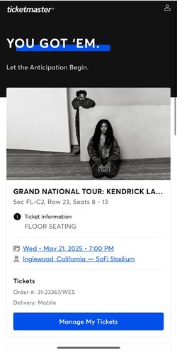 Kendrick Lamar And Sza Floor Seats$1,200Crystal City, CA