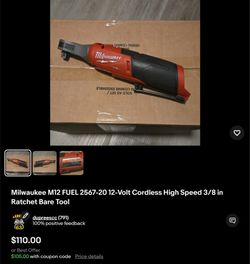 Milwaukee M12 FUEL 2567-20 12-Volt Cordless High Speed 3/8 in Ratchet Bare Tool$110West Covina, CA