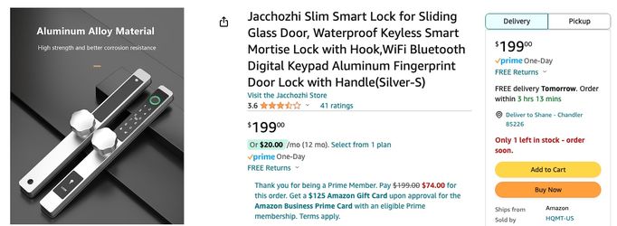 TTLock Smart Lock Wifi, Bluetooth, Fingerprint, Lock$140Chandler, AZ