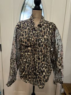 Leopard Print Denim Jacket w/ Silver Sequin Sleeves & Distressed Details$60Friendswood, TX