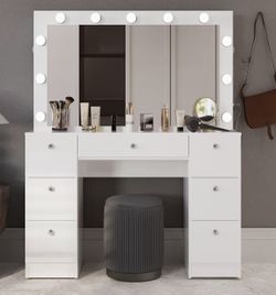 White Makeup Vanity Desk with Hollywood Lights, Bluetooth Speakers, USB-A & USB-C Power Outlet, 7 Drawers, Jewelry Divider, Crystal Knobs & Stool – La$300Burbank, CA