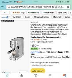 CASABREWS CM5418 Espresso Machine 20 Bar, Compact Espresso Maker with Steam Milk Frother, Stainless Steel Coffee Machine with 34oz Removable Water Tan$60Las Vegas, NV