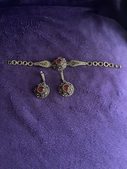 Vintage Bracelet and Earrings Jewelry Set Red Glass Stones Gold Tone Metal Marcasite Style Classic Statement Jewelry Gift$50Los Angeles, CA