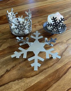 โ๏ธ๐ฏ๏ธ 2 Silver Snowflake Candle Holders 2 White Candles & Snowflake Trivet$12Murrieta, CA