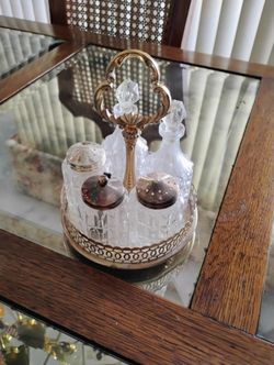 Antique Collectible INTERNATIONAL SILVER Co Pierced Lace Design Silver Plate Footed Cruet/5 Piece Condiment Holder W/Glass Bottles, England$35Tempe, AZ