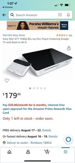 Sony NSZ-GT1 1080p Blu-ray Disc Player Featuring Google TV with Built-In Wi-Fi$75Richboro, PA