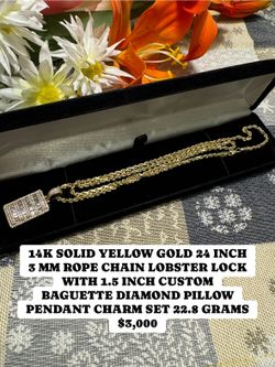 14K SOLID YELLOW GOLD 24 INCH 3 MM ROPE CHAIN LOBSTER LOCK WITH 1.5 INCH CUSTOM BAGUETTE DIAMOND PILLOW PENDANT CHARM SET 22.8 GRAMS $3,000$3,000Las Vegas, NV