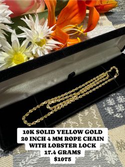 10K SOLID YELLOW GOLD 20 INCH 4 MM ROPE CHAIN WITH LOBSTER LOCK 17.4 GRAMS $1,075Las Vegas, NV