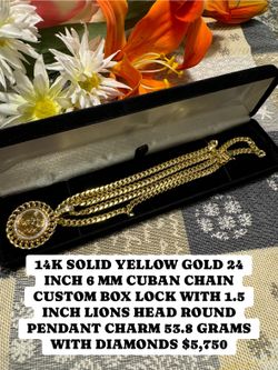 14K SOLID YELLOW GOLD 24 INCH 6 MM CUBAN CHAIN CUSTOM BOX LOCK WITH 1.5 INCH LIONS HEAD ROUND PENDANT CHARM 53.8 GRAMS WITH DIAMONDS $5,750$5,750Las Vegas, NV