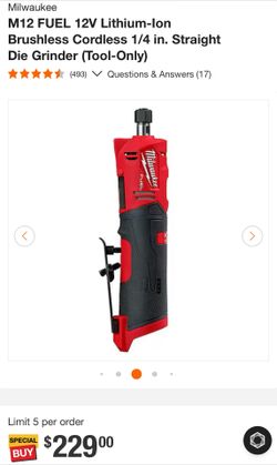 Milwaukee M12 FUEL 12V Lithium-Ion Brushless Cordless 1/4 in. Straight Die Grinder (Tool-Only)$200Pembroke Pines, FL