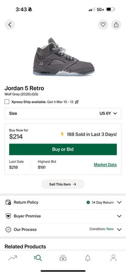 Wolf Grey Jordan 5 Size 6Y Kids GS$220Spring Valley, CA