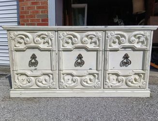 Attractive Vintage Bassett Dresser with Ornate Drawer Fronts - 9 drawers, 5 ft long - Great quality!