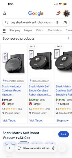 Shark matrix self-emptying robot vacuum$260El Segundo, CA