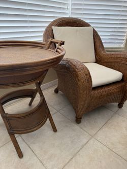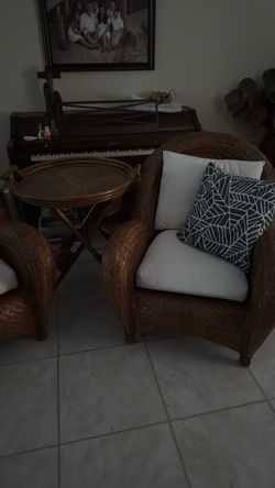 Pottery barn, rattan chairs with cushions and side table$275Boca Raton, FL