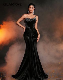 Glamrae Elegant Black Velvet Asymmetric Exaggerated Rhinestone Pleated Front Mermaid Dress With Train, Formal Evening Gown, Prom Dress, For Wedding Gu$68Lake Forest, CA