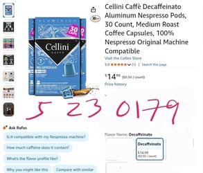 Cellini Caffè Decaffeinato Aluminum Nespresso Pods, 30 Count, Medium Roast Coffee Capsules, 100% Nespresso Original Machine Compatible Brand New$5Las Vegas, NV
