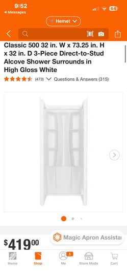 Delta Classic 500 32 in. W x 73.25 in. H x 32 in. D 3-Piece Direct-to-Stud Alcove Shower Surrounds in High Gloss White$300Downey, CA
